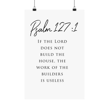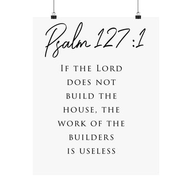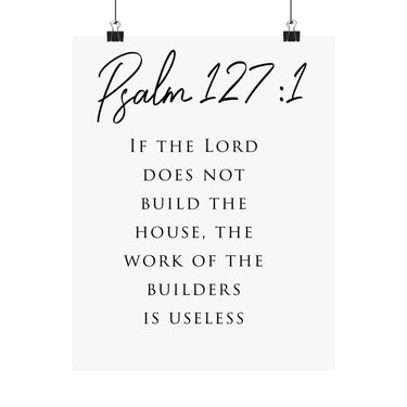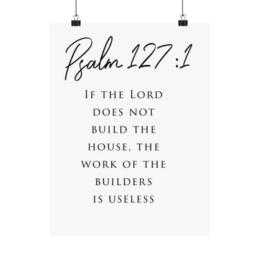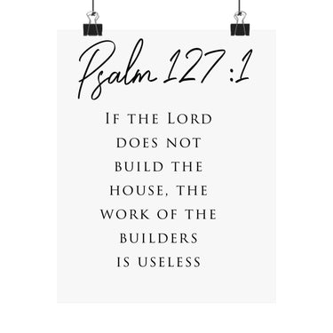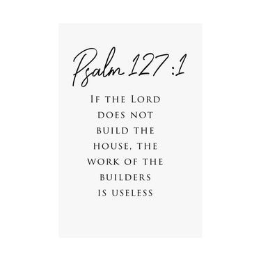 Purposeful and home centered, this matte vertical poster features Psalm 127:1: “If the Lord does not build the house, the work of the builders is useless.” The clean black and white typography creates a bold statement for entryways, living rooms, offices, and home workspaces. A meaningful gift for housewarmings, new homeowners, newlyweds, and anyone dedicating their plans to God. Museum grade paper and giclée printing keep the details crisp and rich, while the matte finish stays soft and glare free. Available in 8 sizes.