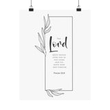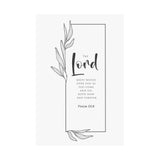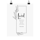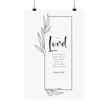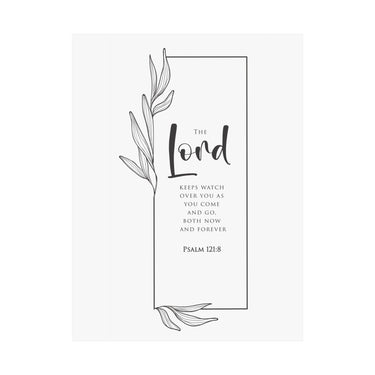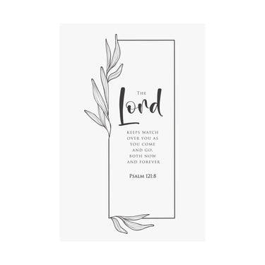 Calming and protective, this matte vertical poster features Psalm 121:8: “The Lord keeps watch over you as you come and go, both now and forever.” The minimalist black and white style with soft botanical accents makes it a beautiful piece for entryways, bedrooms, and family spaces. A meaningful gift for new homes, travel seasons, students, and loved ones you are praying over. Museum grade paper and giclée printing preserve crisp lettering and deep blacks, finished with a matte surface for reduced glare. Available in 8 sizes.
