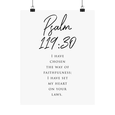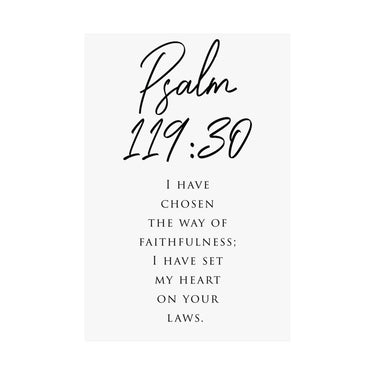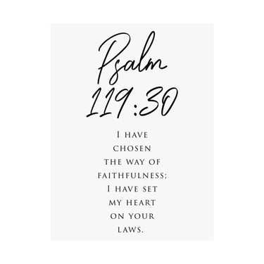 Focused and devotion led, this matte vertical poster features Psalm 119:30: “I have chosen the way of faithfulness; I have set my heart on your laws.” The clean black and white typography with bold script scripture styling creates an intentional statement for offices, study spaces, classrooms, and prayer corners. A meaningful gift for graduates, Bible study friends, and anyone committing their daily life to God’s Word. Museum grade paper and giclée printing keep the details crisp and rich, while the matte finish stays soft and glare free. Available in 8 sizes.