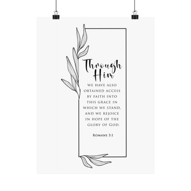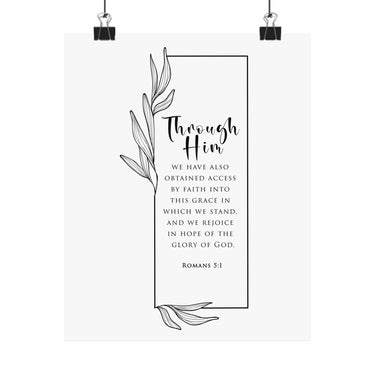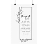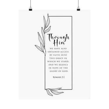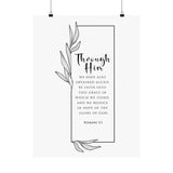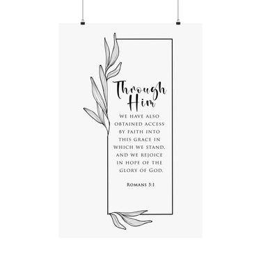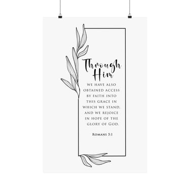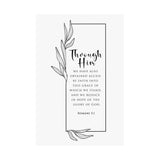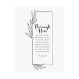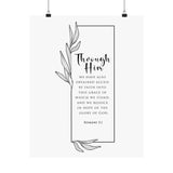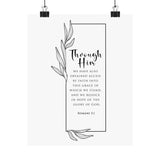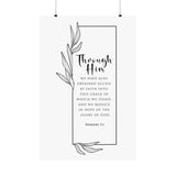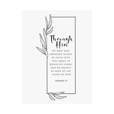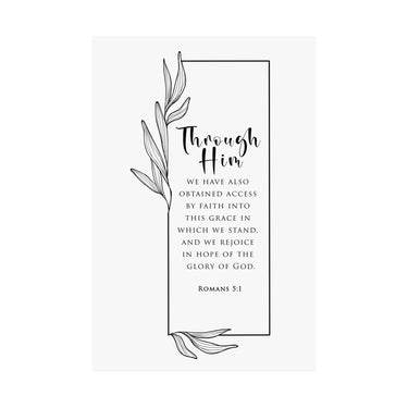 Quietly powerful, this matte vertical poster features “Through Him” in bold script typography, paired with Romans 5:1 and the message of access by faith into grace. The clean black and white layout and simple botanical details give this piece a modern, uplifting presence without feeling busy.