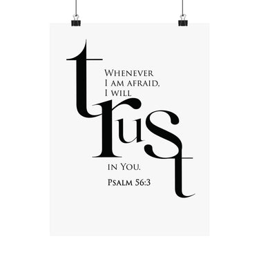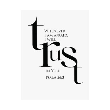 Simple and faith building, this matte vertical poster features Psalm 56:3: “Whenever I am afraid, I will trust in You.” The clean black and white typography makes an uplifting statement for bedrooms, offices, hallways, and prayer spaces. A meaningful gift for anxious hearts, new beginnings, and anyone learning to choose faith over fear. Museum grade paper and giclée printing keep the details crisp and rich, while the matte finish stays soft and glare free. Available in 8 sizes.