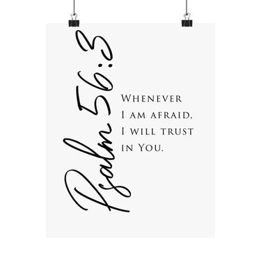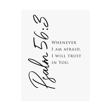 Gentle and faith anchoring, this matte vertical poster features Psalm 56:3: “Whenever I am afraid, I will trust in You.” The clean black and white typography with modern script details creates a calming statement for bedrooms, living rooms, offices, and prayer corners. A meaningful gift for anxious seasons, new transitions, and anyone learning to choose trust over fear. Museum grade paper and giclée printing keep the details crisp and rich, while the matte finish stays soft and glare free. Available in 8 sizes.